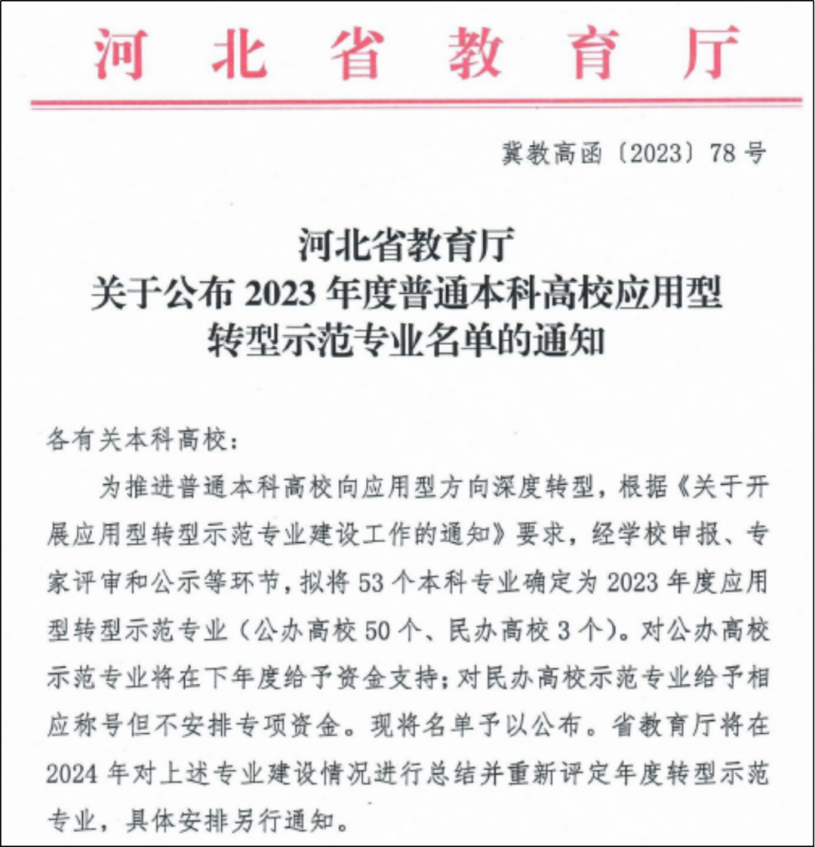 近日,河北省教育厅发布了《河北省教育厅关于公布2023年度普通本科高校应用型转型示范专业名单的通知》,经学校申报、专家评审和公示等环节,拟将53个本科专业确定为2023年度应用型转型示范专业,其中瓜子tv