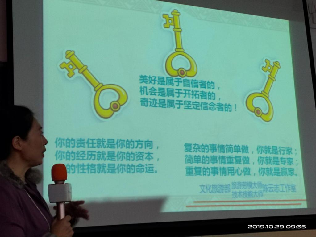 陈云志教授的话语,深入到了同学们的骨子里,使同学们对旅游行业充满了向往与期待。她送给了同学们三把金钥匙,鼓励同学们树立专业信心,保持良好的从业心态,掌握更多的岗位核心能力,努力成长为一名爱岗敬业、业务精良、诚实守信、服务至诚、作风高尚、素质全面的优秀旅游人。
