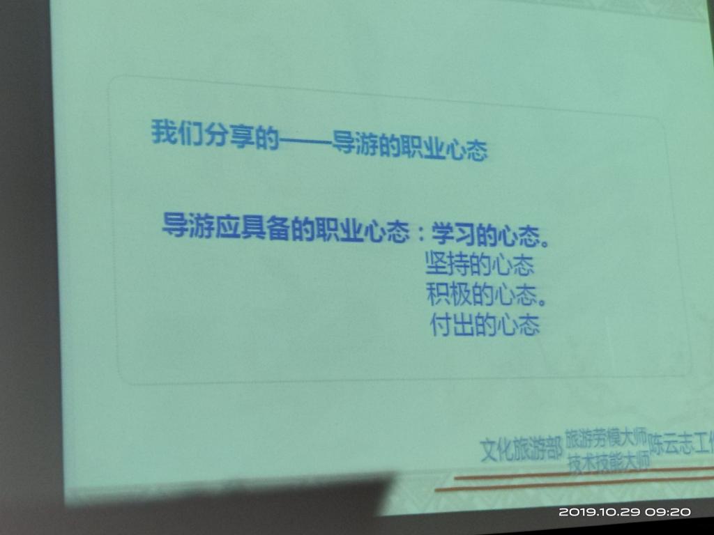 为了深化同学们对旅游行业的专业认同与信心,进一步明确未来的职业规划以及旅游行业的人才需要等,2019年10月29日上午,我们聘请了高级双语导游、文化和旅游部万名英才计划技术技能大师工作室、劳模工作室负责人陈云志老师在 瓜子tv