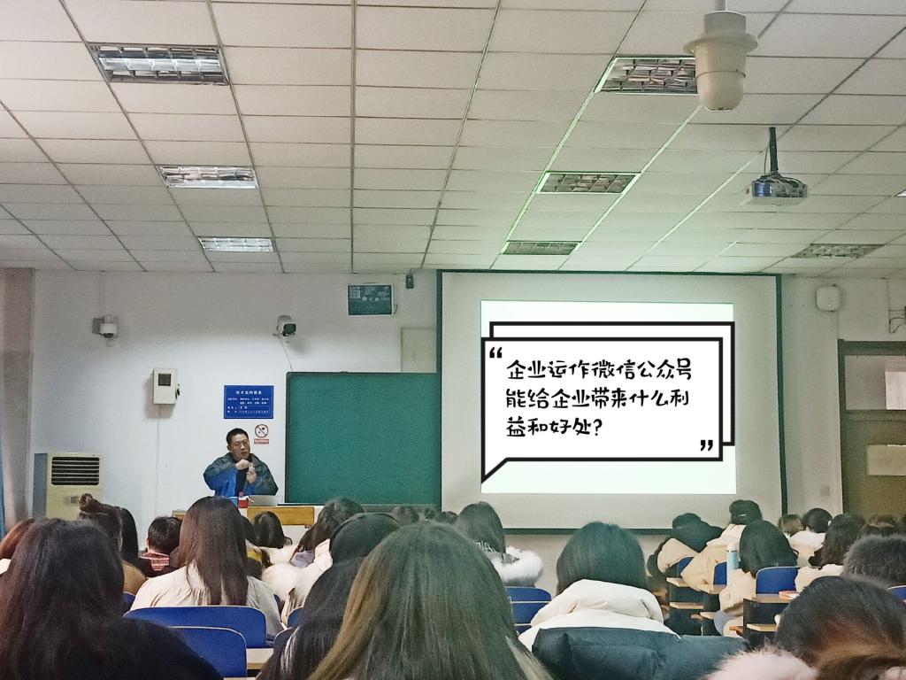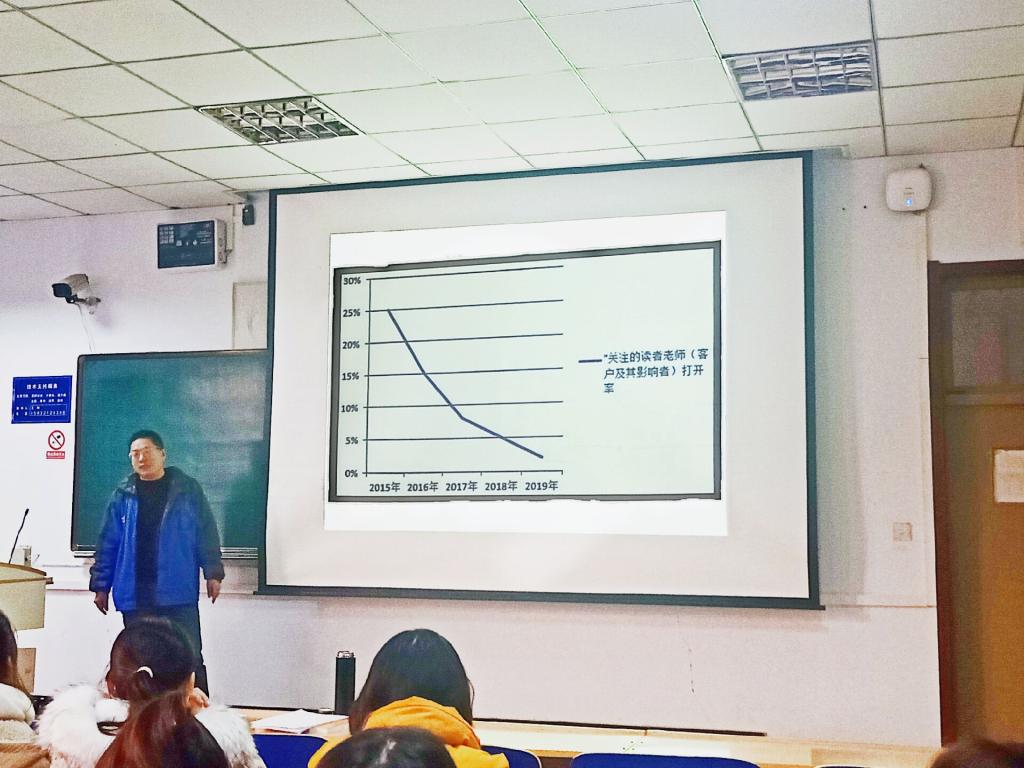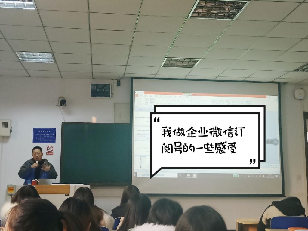 魏总监主要为我们介绍的是关于内容营销与企业微信号运营的七大问题。企业微信号分类与区别、企业运行微信公众号能给企业带来的利益与好处、微信号运营体会与工作多年的感悟、企业自媒体感悟、从企业微信订阅号运行到数据分析到粉丝内容等。对于每个问题魏总监都进行了详细介绍,更大的拓宽了我们的知识领域,让书本知识与实际更好的结合在一起,加深了我们对广告学以及企业微信公众号运营的认知。他给我们讲解了多年来在做微信公众号运行体会,提出了诸多针对我们的具有实际意义的建议,同学们亦聚精会神的听讲,记笔记,颇感兴趣。