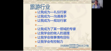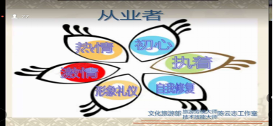 其次,陈老师给我们讲解了目前旅游业的大环境,特别是疫情以来给旅游业带来的巨大变化以及所存在的危机。并着重为我们讲解了作为职业人应具备的十大技能。特别是作为旅游从业者的职业素养和职业要求与能力。