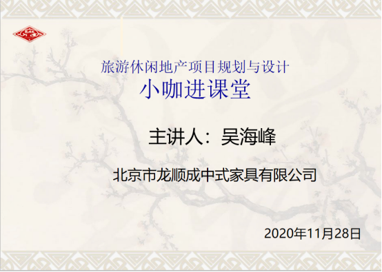 2020年11月27日晚,2018级房地产开发与管理专业必修课程《旅游休闲地产项目规划与设计》网上小咖课堂邀请到了北京市龙顺成中式家具有限公司的吴海峰老师,围绕明清时代古典图样纹饰、雕刻工艺与中式古典家具给大家展开了别开生面的网络课堂。