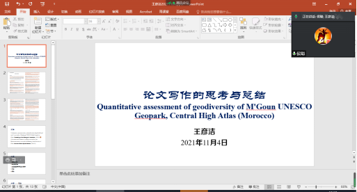 202111411:00,地学旅游团队的旅享科研沙龙活动在线上举行(腾讯会议:ID415438404)。王彦洁以《论文写作的思考与总结》为题,分享了论文写作和审稿的经验。以论文《Quantitative assessment of geodiversity of M'Goun UNESCO Geopark, Central High Atlas (Morocco)》为例,从论文的写作、语言润色、投稿、审稿、修改等方面进行了介绍。在此基础上,团队教师就论文写作中题目的关注点和推广性、论文研究意义等问题进行讨论,归纳下一步的研究思路和重点。