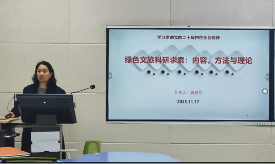 在206教室举办“双百论坛”,学院邀请姚丽芬副教授作了题为“绿色文旅科研求索:内容、方法与理论”的学术分享。本次活动旨在引导全体教师将党的最新理论精神融入科研实践与教学改革,扎实推进学院内涵式发展。学院全体教师参加了本次学习。