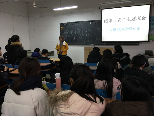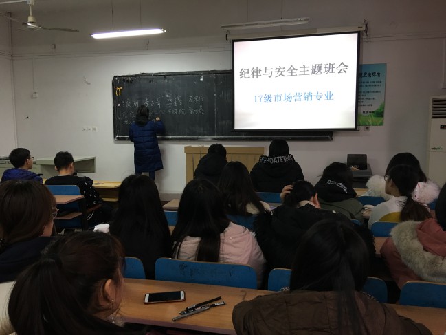 2017级市场营销专业于306教室召开纪律与安全主题班会,会议由营销一班班长孟宋玲主持,17级市场营销专业班主任王锦旺老师出席,全体学生参加。班会结合学校纪律与安全教育主题,每个同学都上台讲述了自己的亲身经历,发人深省,警钟长鸣。