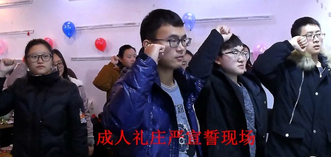 袁老师指出,成年不仅仅意味着年龄的增长,更意味着责任的加重和心智的成熟,要懂得感恩,在以后的人生道路上,要以更加积极的态度和更加理性的思想面对一切,“勿以恶小而为之,勿以善小而不为”,要树立起正确的世界观、人生观、价值观,懂得担当,做一名拥有独立健全人格的公民。台下的同学们用热烈的掌声为他们送上了最真诚的祝福。随后在晚会主持人的领读下,全体同学进行了“我是中华人民共和国公民在18岁成人之际庄严宣誓”仪式,成人礼仪式活动礼毕。
