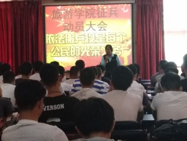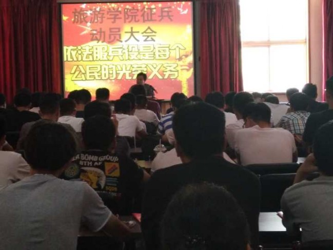 于会展实训室对全体男生举办征兵动员大会,大会由学院副书记耿会清和教师李同法主持,学院相关负责教师及全体男生均参加了本次大会。