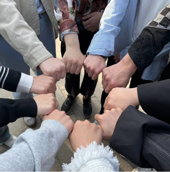 第四个游戏——我们是一家人。同学们结成十个小组,互相拍后背和拍手,并说出对应的语句,用时最短的小组获胜。这个游戏让大家能够互相了解,锻炼了彼此的协作能力。
