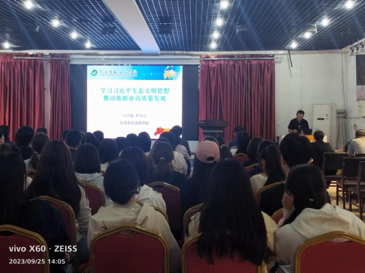 为深入开展学习贯彻习近平新时代中国特色社会主义思想主题教育走深走实,全面落实党的二十大精神,2023年9月25日, 瓜子tv 党委邀请河北省社科院二级研究员刘书越作了题为“学习习近平生态文明思想,推动旅游业高质量发展”的专题报告。学院党委委员、全体教职工及学生代表共计60余人参加。报告由 瓜子tv 党委委员、副院长孙振杰主持。