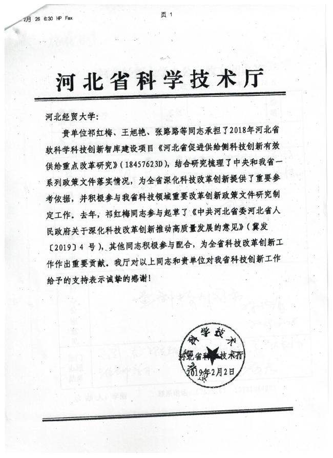 三位教师承担了2018年河北省软科学科技创新智库建设项目《河北省促进供给侧科技创新有效供给重点改革研究》(18457623D),