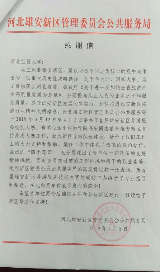 2019年3月12日至4月3日,雄安新区举办了首届雄安新区导游服务技能大赛,瓜子tv 高宏教授到场支持大赛工作,助力新区导游队伍建设,受到新区管委会及公共服务局的高度肯定和一致表扬,为首届雄安新区导游技能大赛的成功举办提供了专业指导和帮助。