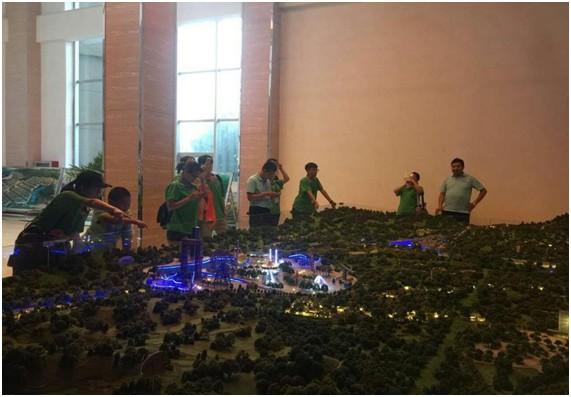 暑期社会实践小分队的成果给予了高度的肯定与赞扬。他十分欣赏同学们勇往直前、不怕吃苦的精神,并带领小分队参观了景区的微缩模型。在参观过程中,刘经理介绍了更多景区的信息,包括度假区的建设理念,在建情况、目前规划等,使小分队成员对西部长青度假区的了解更加深入全面,对它未来的发展更有信心。图为刘经理带领小分队参观沙盘。