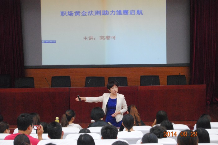 报告会上,高睿可从角色转换、职业精神、职业道德三个方面详细、生动的阐述了大学生在职场中的职业规划及职业发展问题,通过分享自身多年的职业培训经验,向同学们阐明了“提升融入环境能力”、“保持敬业的职业态度”“责任胜于能力”的观点。高睿可老师的肺腑之言和现场互动赢得了学生的阵阵掌声。