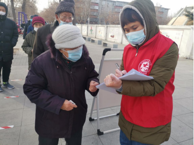 疫情爆发后,1月6日上午一看到社区招募志愿者的消息,宋素巧老师和儿子白绍杰第一时间就报名参加,走到了防疫第一线。经贸社区是个老小区,有31栋楼,1149户,2900多居民,其中老人比较多。为了尽量让老人们少些等待,为了节省检测时间,社区为每家都做了信息表,母子俩冒着严寒,不辞辛苦,挨家挨户敲门,把信息表发给居民让他们填好,并进行简单询问,对居民情况进行初步摸排。