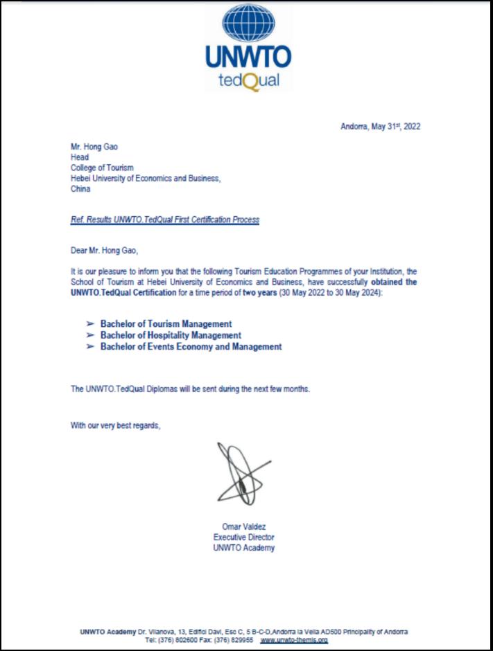 旅游管理类三个专业通过联合国世界旅游组织教育质量认证(UNWTO TedQual)