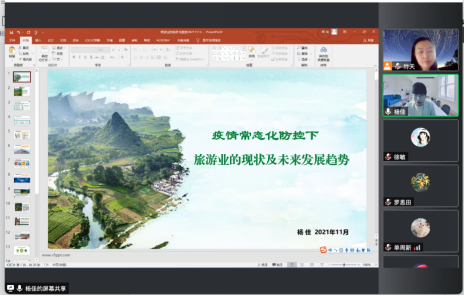 分享会上,杨佳老师结合自身丰富的从业经验,从疫情常态化防控下旅游业的现状和未来发展趋势出发,进行了详实有深度的分享。杨佳老师从“疫情给旅游业带来的新变化”、“网红旅游的崛起”等多个视角维度,对旅游业的现状做了深层次剖析,重点讲解了“游客的居民化和居民的游客化”,随后就2021年“双十一”战报与同学们展开讨论交流,指出了今年“双十一”消费趋势的有质增长,最后杨佳老师分析了疫情常态化防控背景下旅游就业的几大方向以及优缺点,为同学们提供了未来就业方向的指导。分享会结束后,庞笑笑老师和杨佳老师就“本科生毕业以后考研还是就业”这一问题进行了交流。