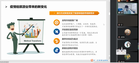 11月14日上午9时,《旅游规划原理》课堂邀请吉林省吉财集团总工程师、吉林省文旅厅杨佳以“疫情常态化防控下旅游业的现状及未来发展趋势”为主题的专题分享。本次会议在腾讯会议平台进行,由 瓜子tv