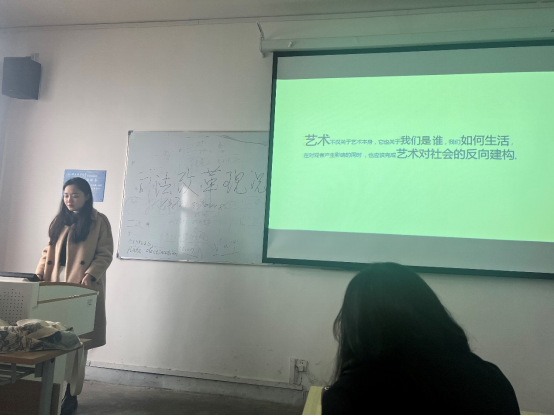 分享会以“艺术与旅游”为主题,以艺术家及作品为主线,分析了当下艺术的表达与社会功能。分享主要分为三部分,安老师首先带领大家对西方美术史进行了简单明了的回顾,让大家对艺术的发展有了更直观认识;第二部分重点关注艺术与乡村,结合杨蹬艺术合作社、关中忙罢艺术节等案例,深入分析了艺术的社会功能;最后,与同学们一起探讨了艺术与社会责任、艺术与创造力等话题,在讨论艺术的同时,引导同学们反思旅游的社会责任与创造力等问题。最后,安老师告诉大家,“艺术不仅关于艺术本身,它也关于我们是谁,我们如何生活,在对观者产生影响的同时,也应该完成艺术对社会的反向建构。”