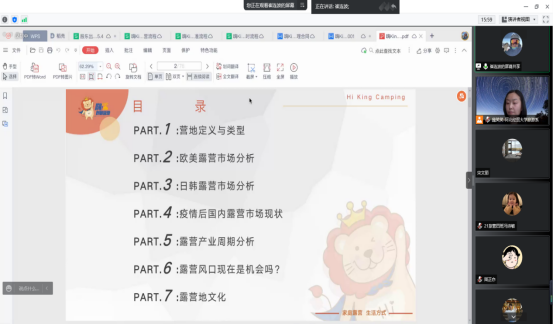 崔老师从营地的定义与类型、欧美与日韩露营市场分析入手,重点分析了疫情背景下我国的露营市场现状及产业周期。之后结合自身丰富的从业经验,分享了嗨King野奢营地的创立、发展状况、产品设计以及在线运营等一系列标准化操作程序(SOP)。最后崔老师与师生进行了互动交流,主要就行业对专业人才的素养要求、实习岗位、疫情影响下的旅游发展态势研判等方面进行了深入交流。