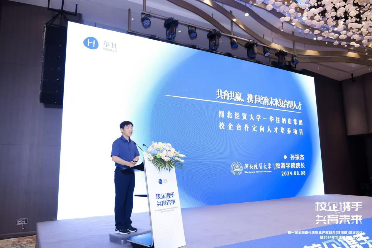 院长孙振杰受邀作为华住集团深度合作优秀本科院校的代表,在大会上作教育部供需对接就业育人项目优秀案例建设经验的报告分享,详细讲解了双方共建定向人才培养项目的合作历程、合作内容、合作成果、合作经验,并重点总结和分享了双方在合作机制、合作模式、合作平台、合作领域等方面的创新与探索,以期为产教融合共同体框架下的校企合作项目深度开展提供有益的参考和借鉴。