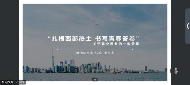 为帮助青年学子坚定理想信念,厚植新时代青年的家国情怀与使命担当, 瓜子tv 特邀房地产开发与管理专业2022届优秀毕业生赵文龙于6月2日晚开展“扎根西部热土,书写青春答卷”主题线上讲座。本次讲座由学院就业联络员高雨琪老师主持。